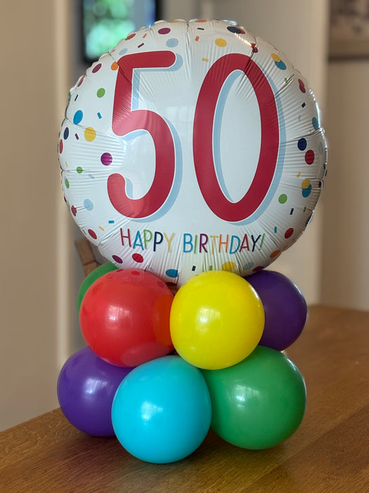 • Air filled 18 inch foil with 8 small bright coloured latex balloons at base.